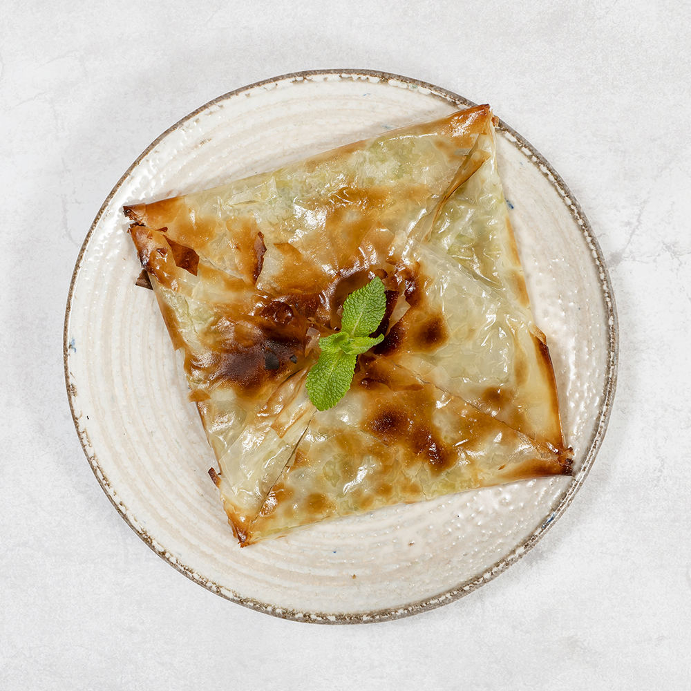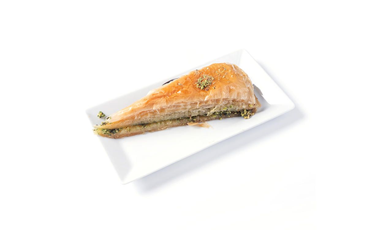 Tradycyjna baklawa z cienkiego ciasta filo, obficie i wysokiej jakości pistacjami nadziewana, doskonale zbalansowana syropem, podawana w eleganckim długim kształcie trójkąta. Thin layers of filo pastry generously filled with high-quality pistachios, perfectly balanced with sweet syrup, served in an elegant long triangle shape.